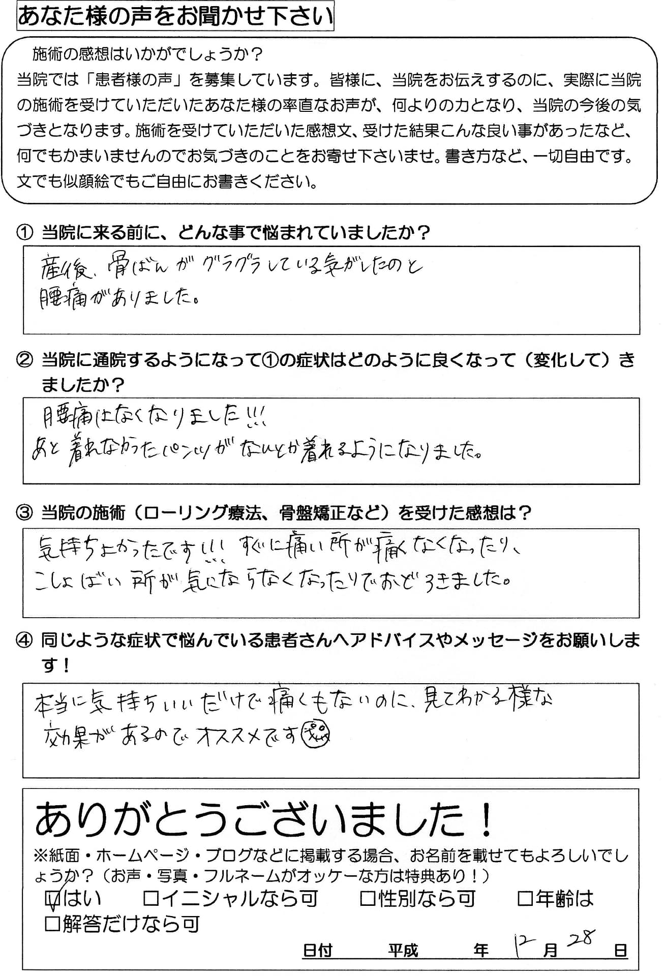 そしてほとんどの患者さまが書いてくれていますが、当院の骨盤矯正とローリング療法は「気持ちのいい施術方法」です!!