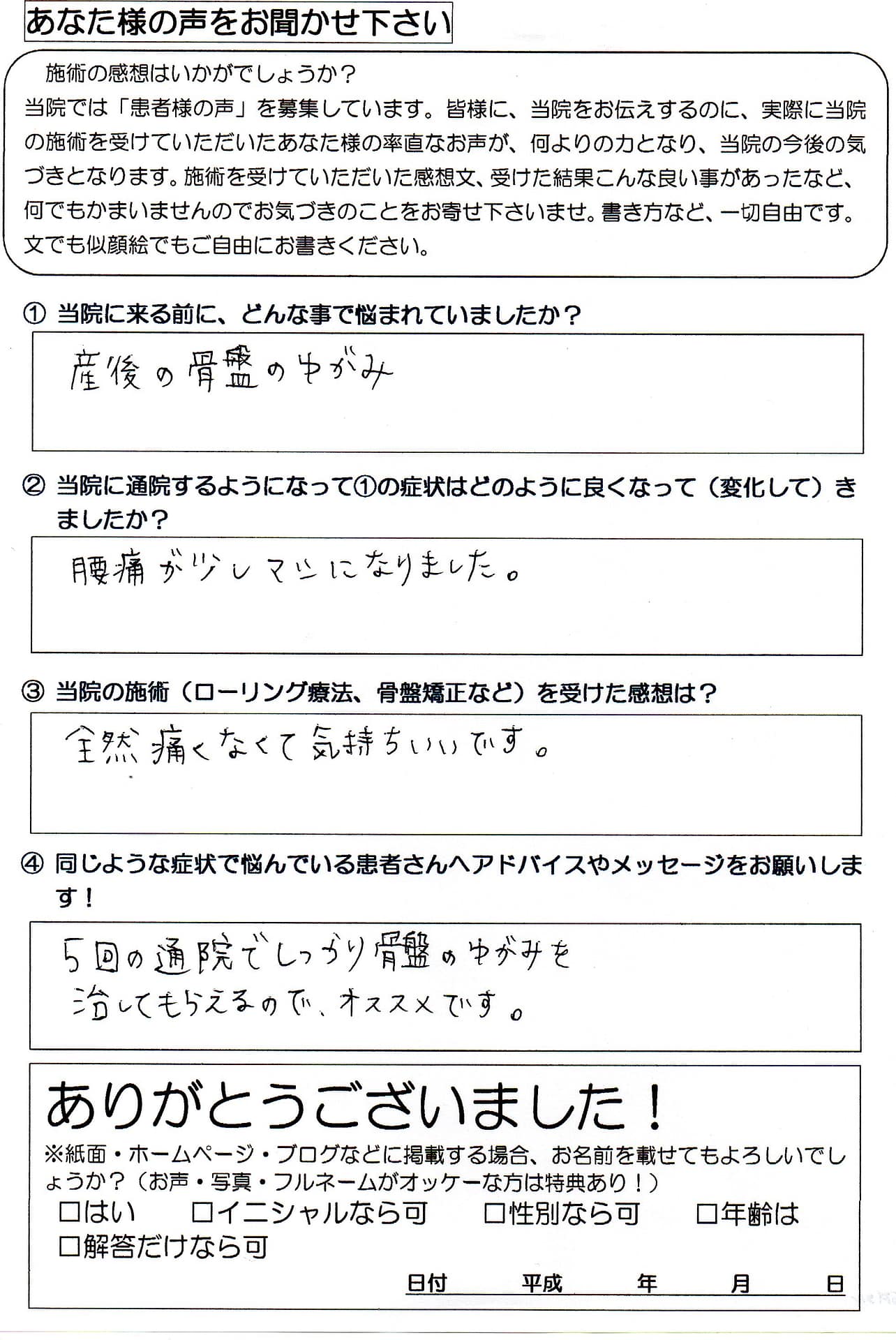 Y.Iさまは2人目の出産後の骨盤矯正と腰痛でご来院くださいました。